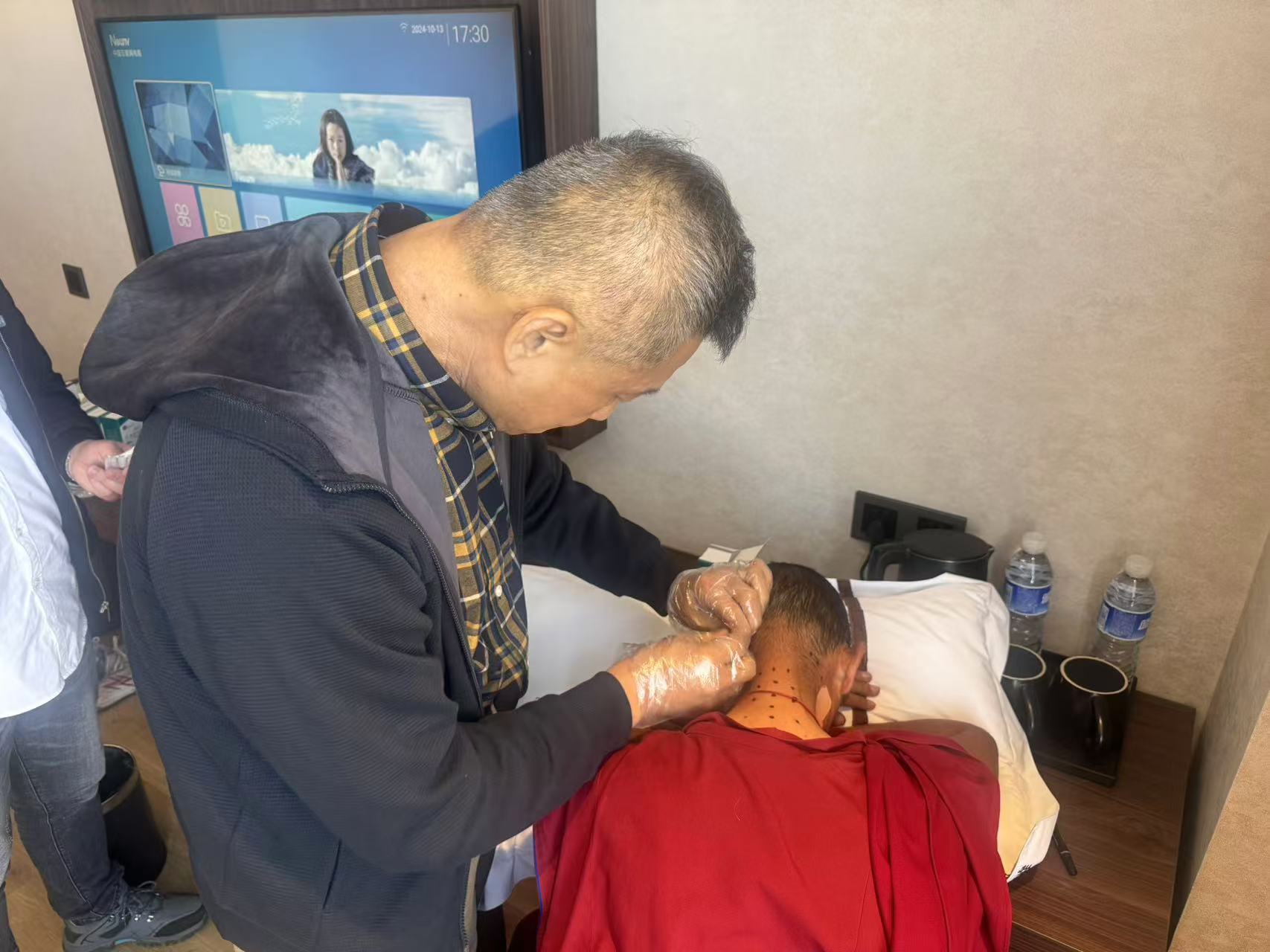 义诊小队刚下榻到酒店,还来不及修整,便有慕名而来的患者堵到酒店房间门口找专家看诊,患者自诉颈部酸痛、活动受限,想请医生帮忙看一下,顾不得路途颠簸和高反带来的不适,叶刚教授立即投身到义诊工作中,根据患者的描述耐心寻找疼痛点,对患者进行针灸治疗,扎针治疗后,患者即感觉颈部舒坦,颈部活动较前明显好转。患者连连赞叹叶刚教授医术高超。